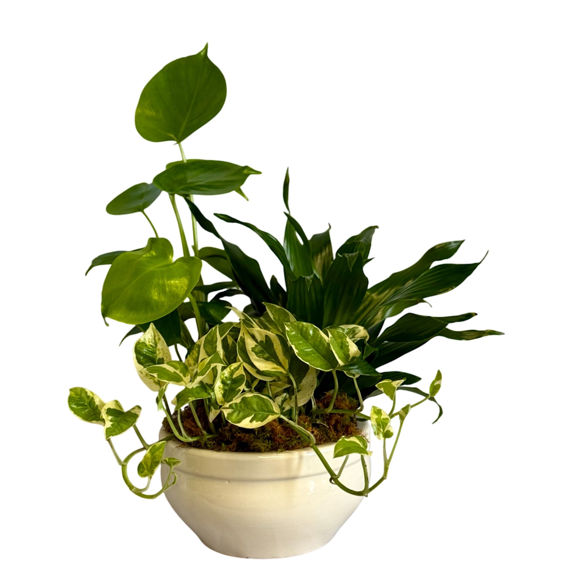 The Andie planter features indoor, easy-to-care-for green and variegated plants. 4-inch pearls & jade pothos, monstera, and dracaena green jewel plants nestle in a bed of fresh sheet moss.