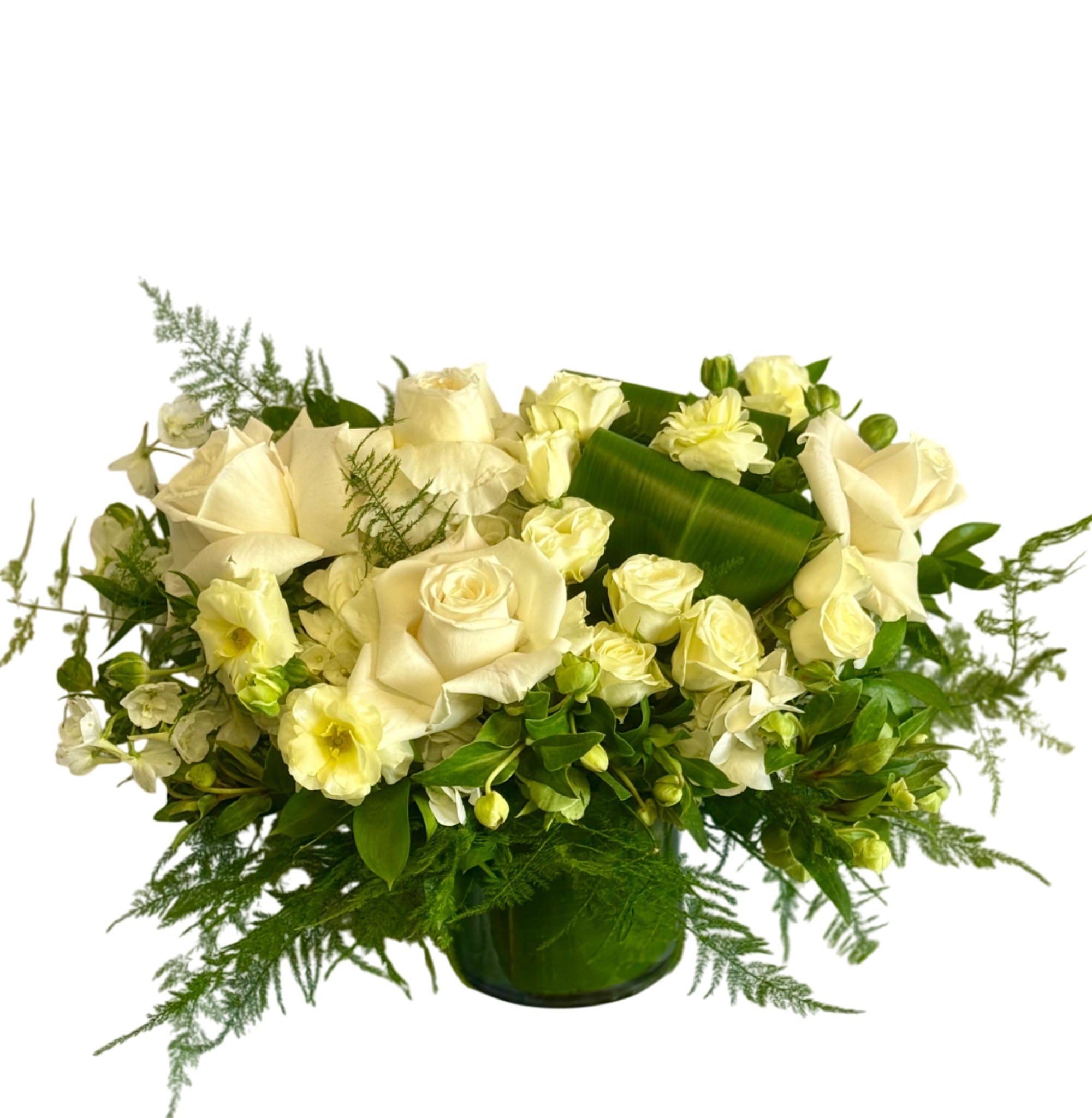 A loose, garden-style design featuring roses, hellebores, delphinium, ranunculus, spray roses and plumosa in a ti leaf-lined glass cylinder. 14”H x 18”W.