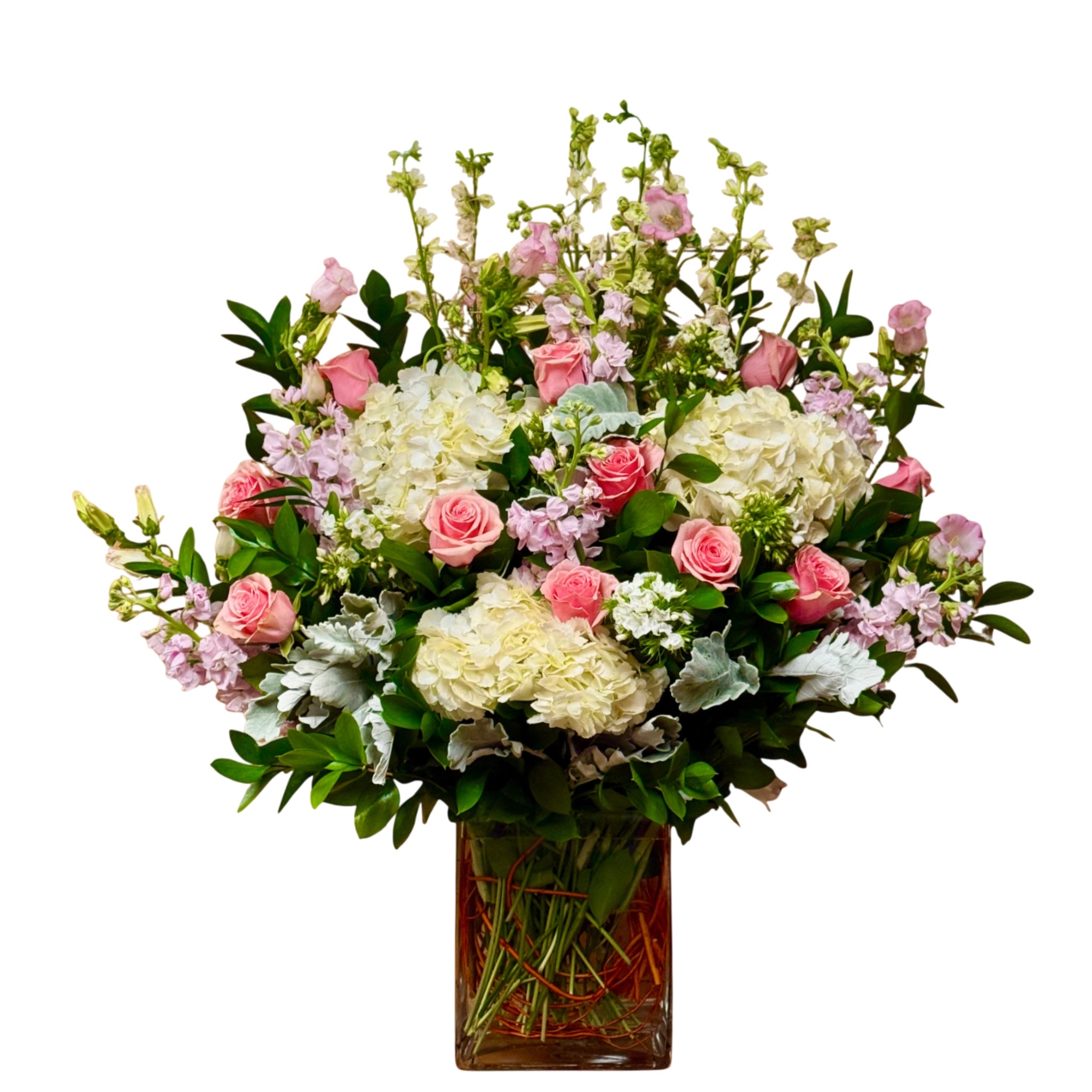 Make a grand statement with this impressively large arrangement. One dozen Geraldine roses, white campanula, pink larkspur, pink stock and silver dusty miller are artfully arranged in a clear glass container. 34”H X 28”W.
