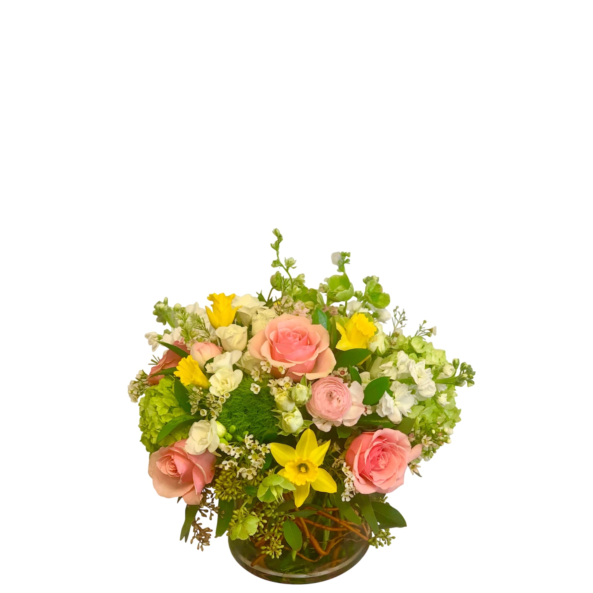 Pink, yellow, white and green color scheme, with roses, daffodils, ranunculus, hellebores, stock and mojito hydrangea.