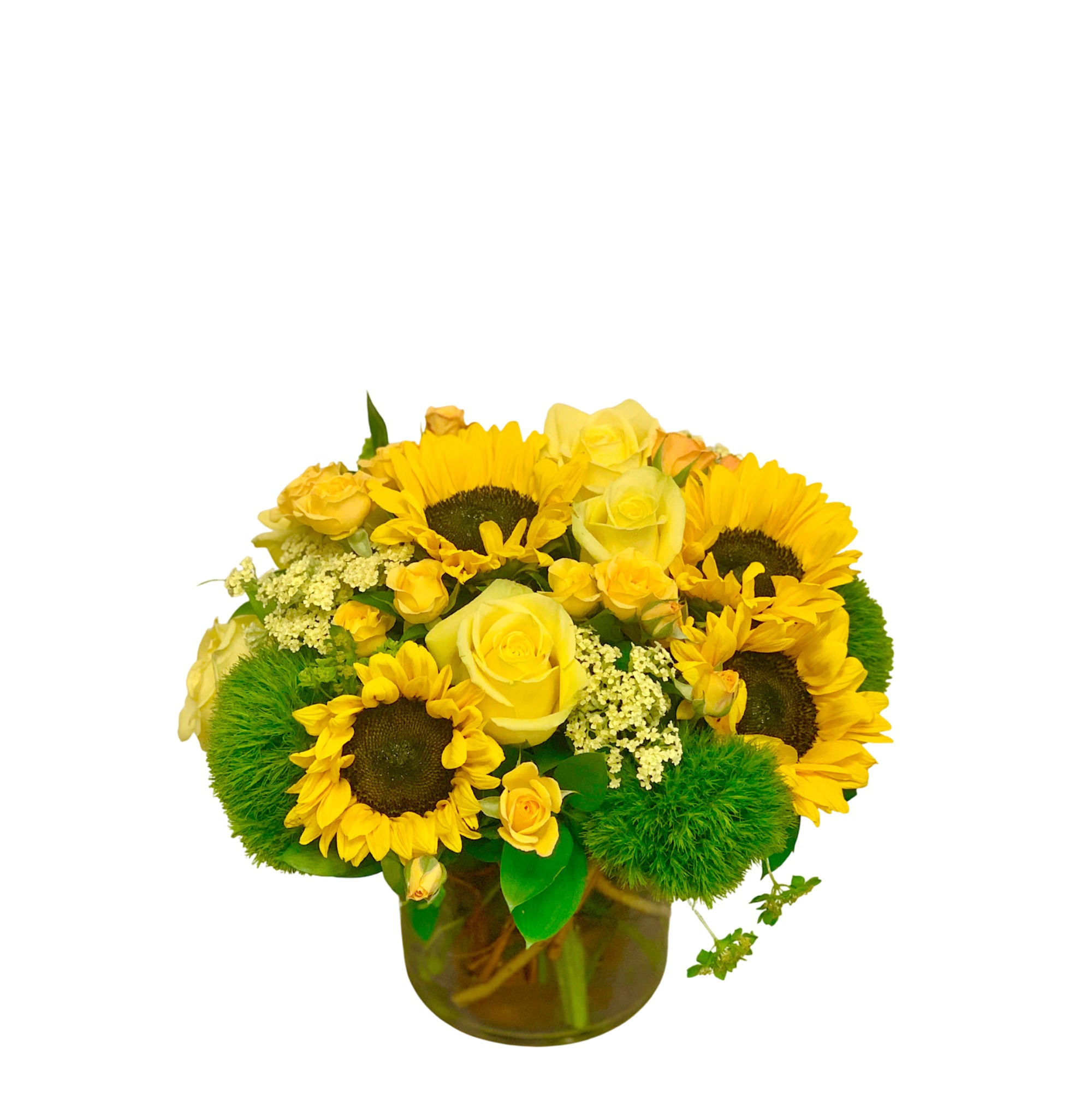 Sunflowers, roses, spray roses, and green trick dianthus in a clear glass vase
