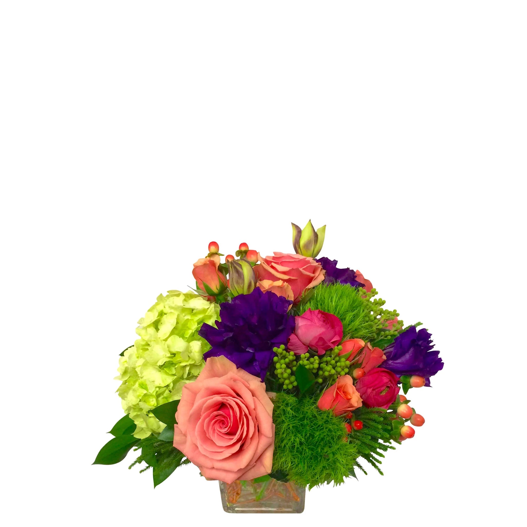 A tight, densely packed arrangement with roses, lisianthus, ranunculus, green trick and hydrangea. 9”H X 7.5”W.