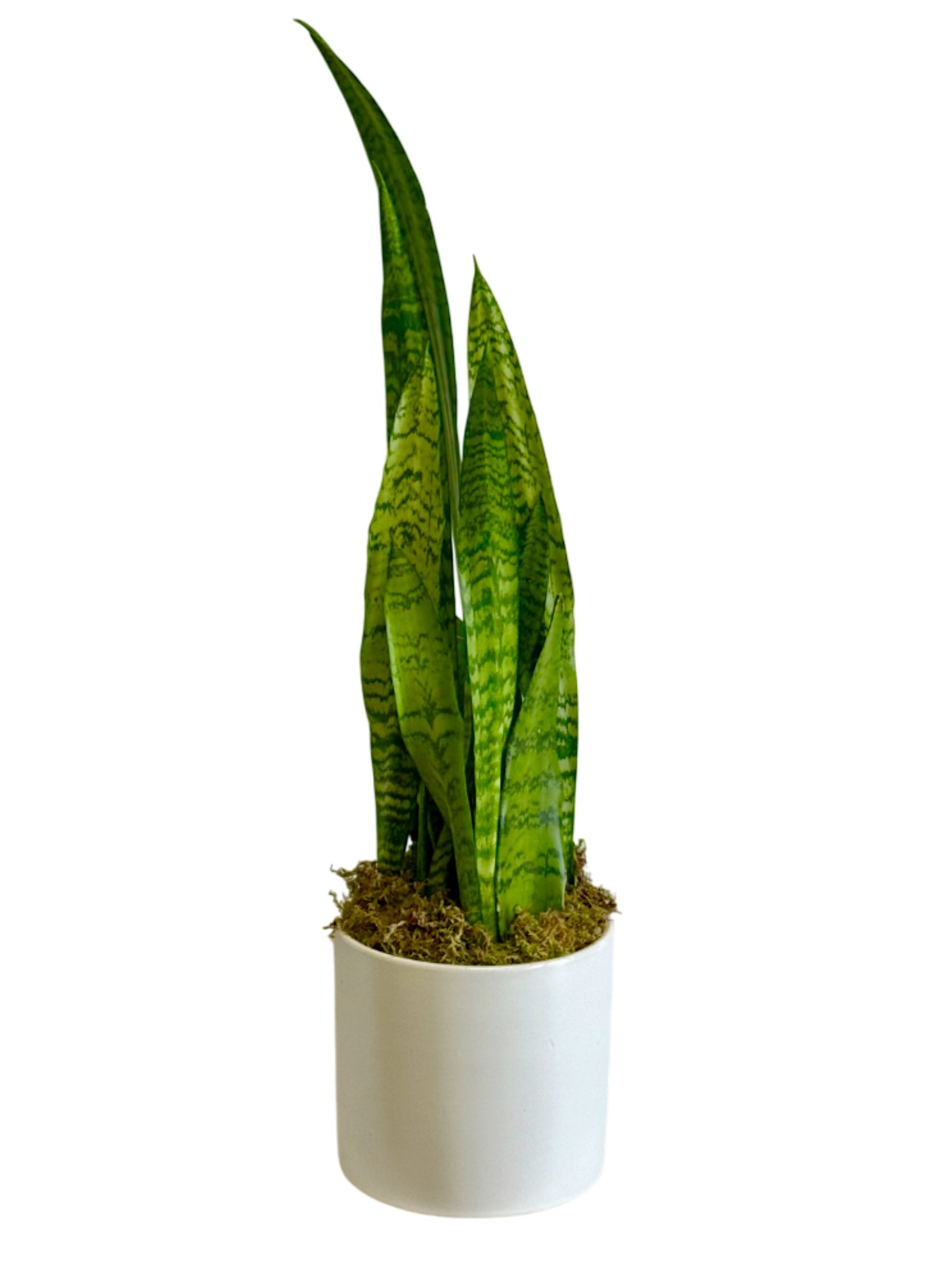 A snake plant (dracaena trifasciata), with fresh sheet moss, in a white ceramic container. About 28” tall.