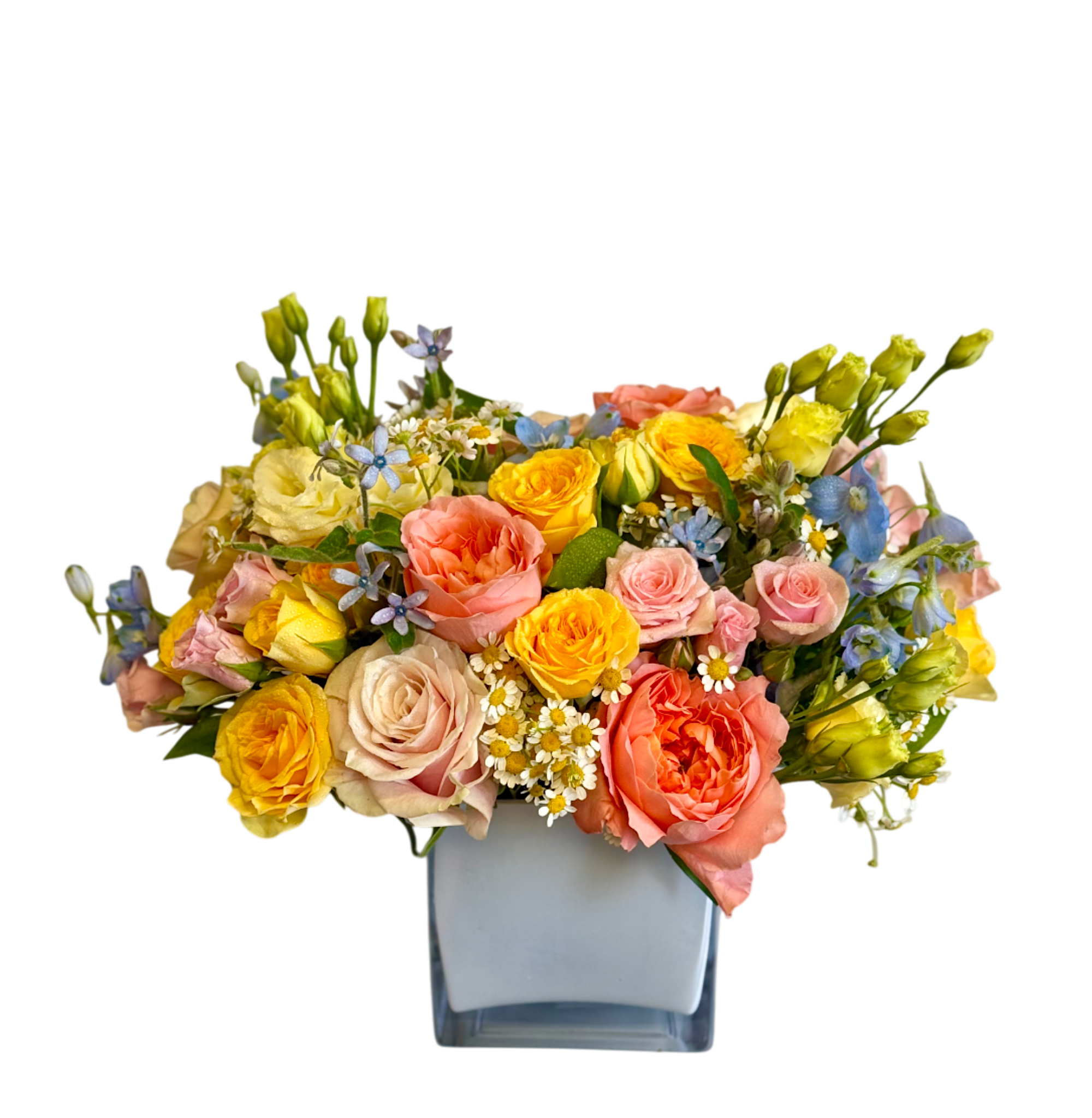 A cheerful arrangement of the vibrantly-colored flowers you’d see while walking on a bright summer day. Featuring kahala and pink mondial roses, elba and yellow babe spray roses, yellow lisianthus, blue tweedia and delphinium, and white and yellow chamomile, artfully arranged in a white glass cube. 12”H x 15”W.